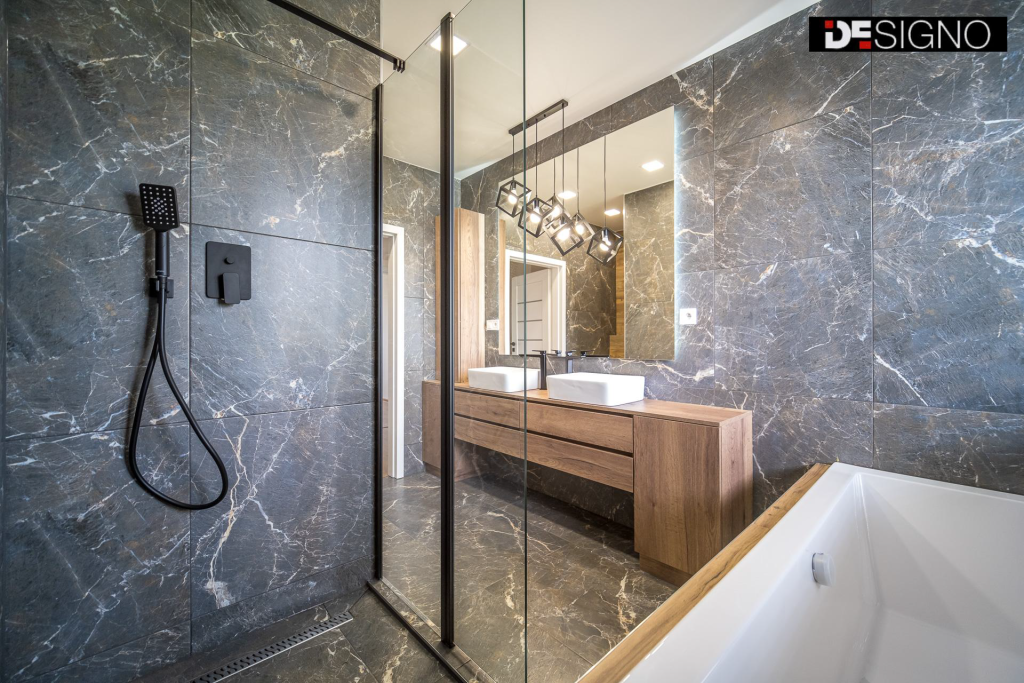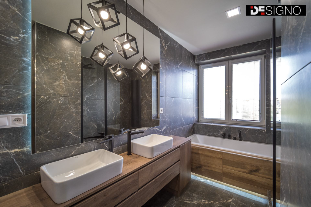 Koupelny v panelových bytech mají často tu nevýhodu, že postrádají přirozené světlo. Nemusí to tak ale být vždy. Dá se vytvořit prostorná koupelna s oknem a kompletním sanitárním vybavením – toaletou, dvěma umyvadly, sprchovým koutem i vanou. Nechybí ani praktické skříňky na hygienické potřeby a zrcadlo. Neotřelý prvek, který upoutá na první pohled, představují šedé obklady s bílým žilkováním.