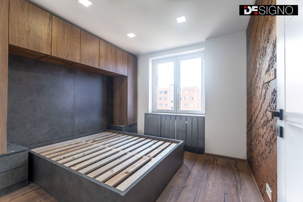 Z obyčejné 1+1 se nám podařilo vytvořit plnohodnotný byt 2+kk. Hlavní prostor tvoří neotřelá kuchyňská linka s vestavěnými spotřebiči, která se prodlužuje do obývací stěny. Na zdi za ní jsme aplikovali oblíbená stěrka dodávající prostoru nadčasovost. Ložnice je krásně prosvětlená a stejně originální jako zbytek bytu – dominantu představuje manželská postel s nástavcem v jednoduchém, přesto efektním dekoru.